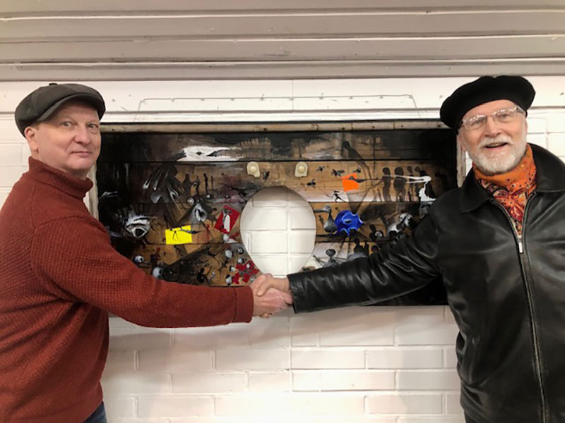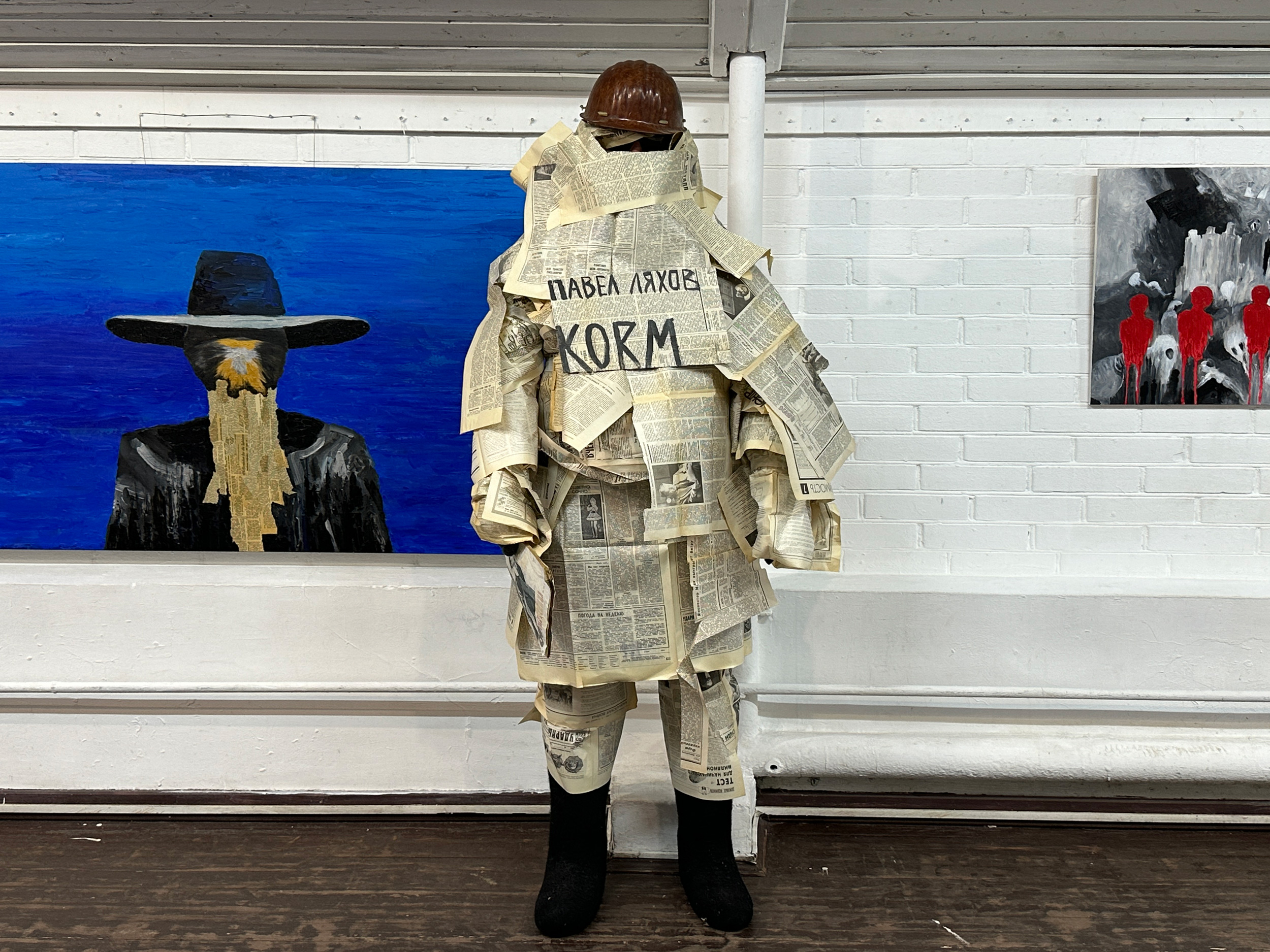 В работах Ляхова технология ручной аппликации обретает концептуальное звучание. Фанера как основа и рваные газетные фрагменты — это не только эстетический выбор, но и метафора хрупкости исторической памяти.